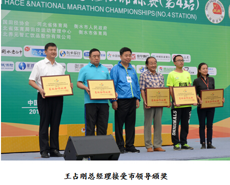 在最后的授牌儀式上,王占剛接受了市領(lǐng)導(dǎo)頒發(fā)的“2016衡水湖國際馬拉松賽唯一指定用酒”銘牌。