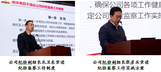 會議宣讀了《河北衡水老白干酒業(yè)股份有限公司紀(jì)檢監(jiān)察工作制度》和《河北衡水老白干酒業(yè)股份有限公司紀(jì)檢監(jiān)察工作實施方案》,提出了紀(jì)檢監(jiān)察工作的指導(dǎo)思想,公布了紀(jì)檢監(jiān)察工作領(lǐng)導(dǎo)小組成員名單、反映問題郵箱和電話,提出了紀(jì)檢監(jiān)察工作的八項重點工作。